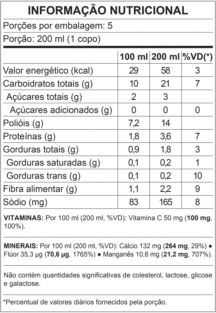 Água, suco vegetal de soja, eritritol, cacau em pó, fosfato tricálcico, estabilizante: carragena, espessante: goma guar, sal, alfarroba, ácido ascórbico e aromatizantes.