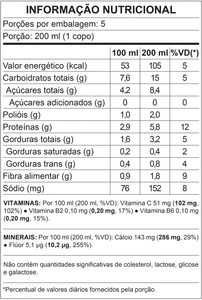 Suco vegetal de soja, água, suco de maçã, eritritol, aromatizante, fosfato tricálcico, estabilizante: carragena, espessante: goma guar, ácido ascórbico, sal e tripolifosfato.